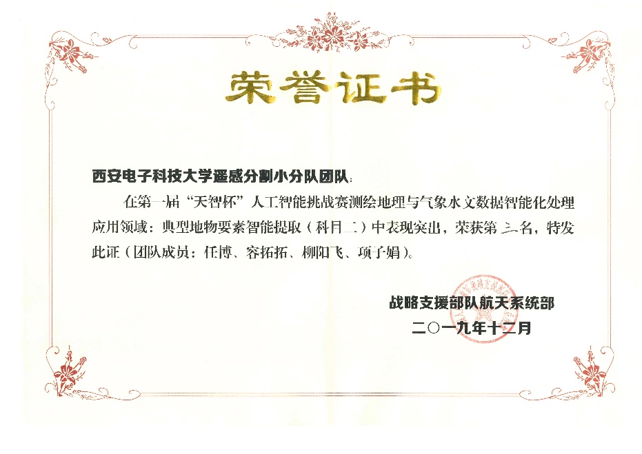 2019年12月19日,第一届“天智杯”人工智能挑战赛决赛在北京成功落下帷幕。“测绘地理与气象水文数据智能化处理应用”主题科目二中,在太阳成集团tyc122ccvip侯彪教授和任博老师带领下,太阳成集团tyc122ccvip“遥感分割小分队”荣获全国总决赛季军。